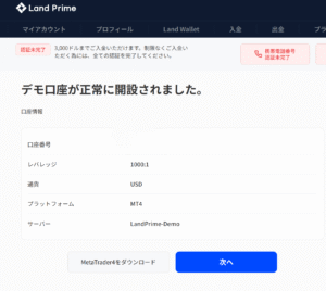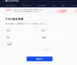 Land Prime(旧Land FX)のデモ口座の特徴は、以下のとおりです。