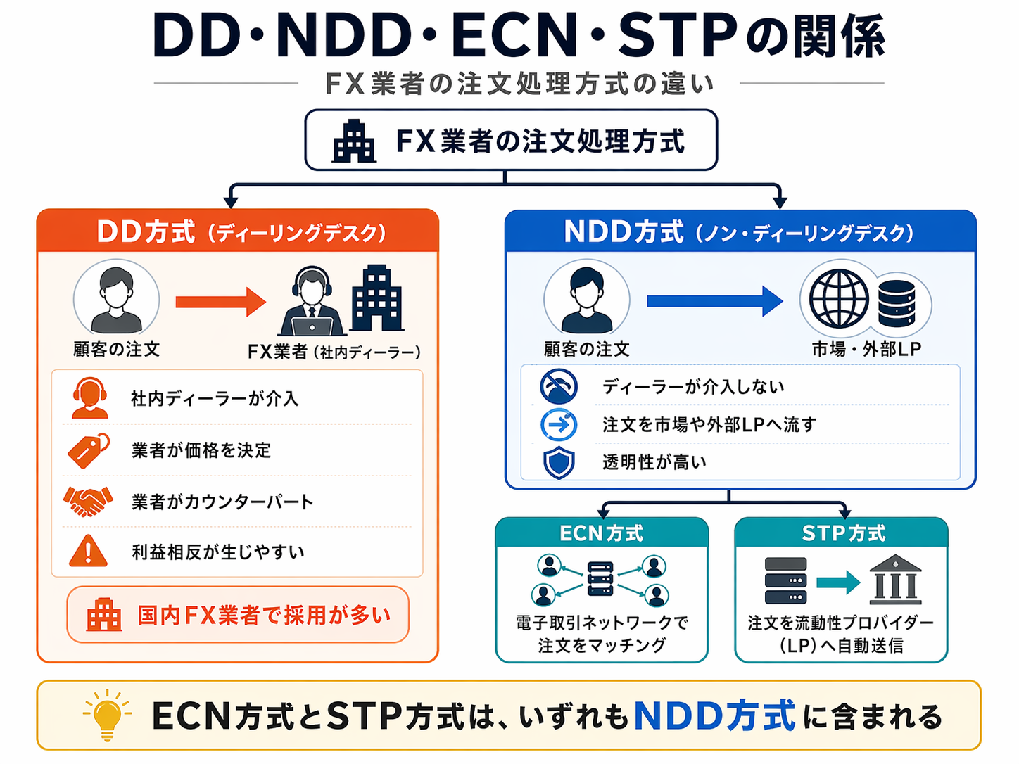 海外FX業者が「ECN口座」「STP口座」と呼ぶのは、いずれもNDD方式の中の分類です。