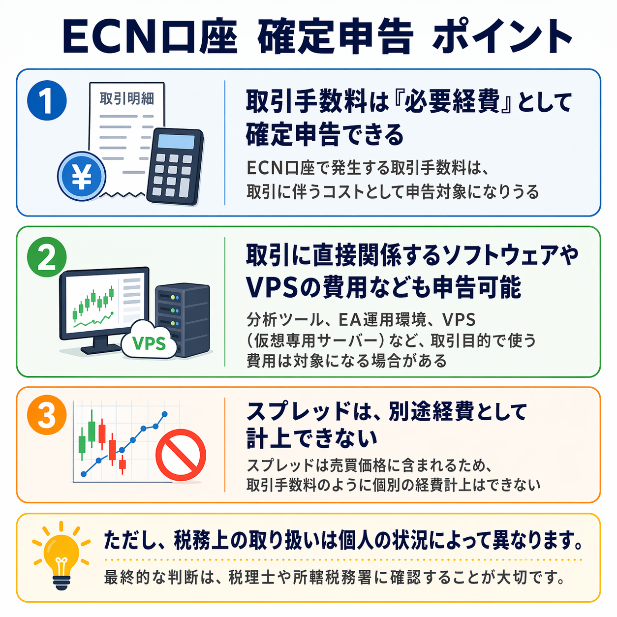 ECN口座で支払った取引手数料は、確定申告の際にFX取引の必要経費として計上できます。