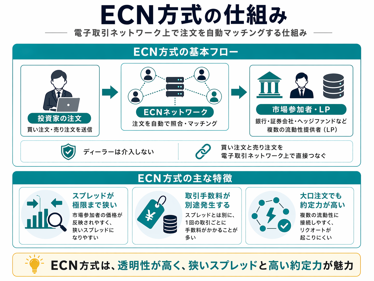 ECN方式との最大の違いは、「市場参加者同士の直接マッチングか」「業者が提携するLPへの転送か」という点です。