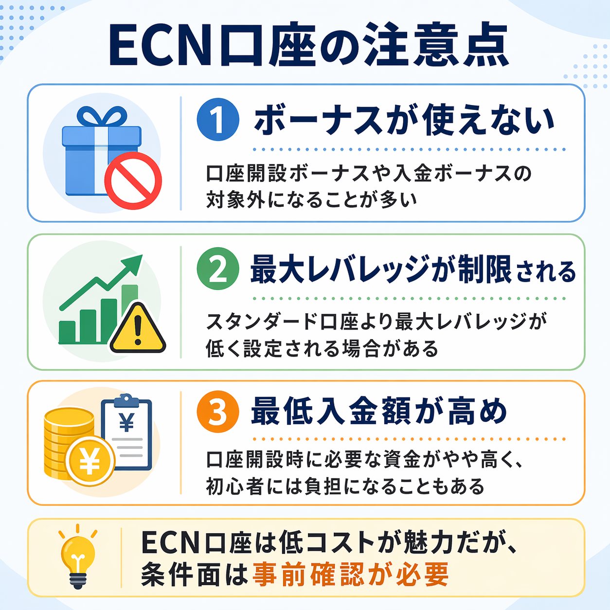 業者によっては200〜1,000ドル程度の最低入金が必要です。資金が少ない段階でECN口座を選ぼうとしても、そもそも開設できない場合があります。