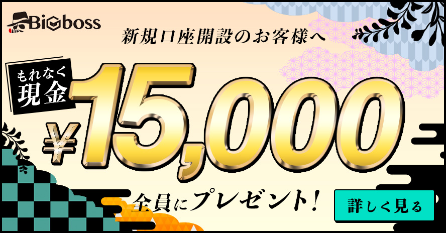 キャンペーン期間中に、当サイトを利用して海外FXブローカー【BIGBOSS】の新規口座開設をし、10万円以上のデポジットおよび合計1ロット以上のお取引をされた【お客様全員】に現金15,000円をプレゼントいたします。