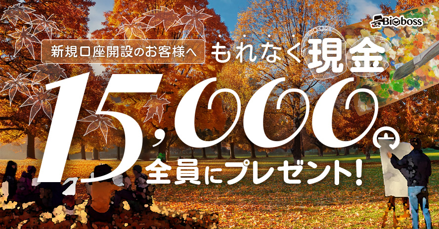 キャンペーン期間中に、当サイトを利用して海外FXブローカー【BIGBOSS】の新規口座開設をし、10万円以上のデポジットおよび合計1ロット以上のお取引をされた【お客様全員】に現金15,000円をプレゼントいたします。