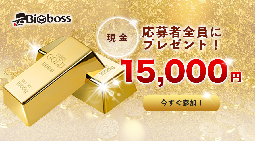 キャンペーン期間中に、当サイトを利用して海外FXブローカー【BIGBOSS】の新規口座開設をし、10万円以上のデポジットおよび合計1ロット以上のお取引をされた【お客様全員】に現金15,000円をプレゼントいたします。