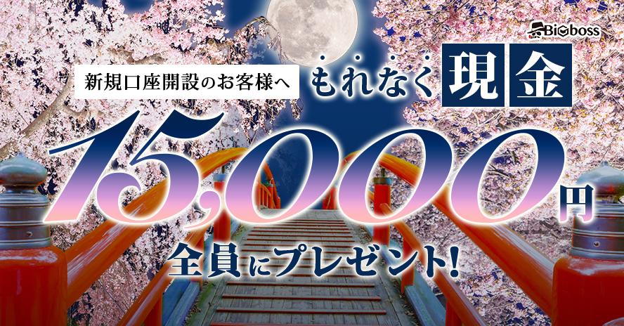 キャンペーン期間中に、当サイトを利用して海外FXブローカー【BIGBOSS】の新規口座開設をし、10万円以上のデポジットおよび合計1ロット以上のお取引をされた【お客様全員】に現金15,000円をプレゼントいたします。