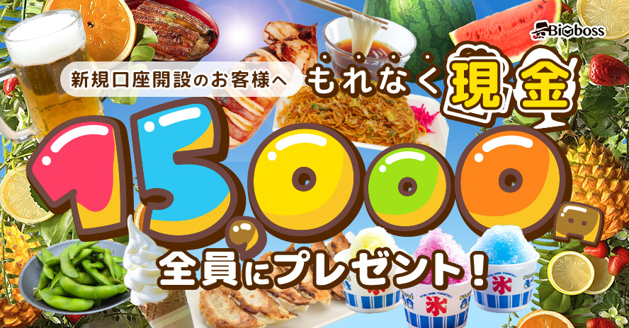 キャンペーン期間中に、当サイトを利用して海外FXブローカー【BIGBOSS】の新規口座開設をし、10万円以上のデポジットおよび合計1ロット以上のお取引をされた【お客様全員】に現金15,000円をプレゼントいたします。