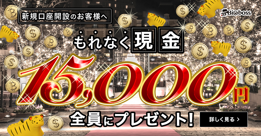 キャンペーン期間中に、当サイトを利用して海外FXブローカー【BIGBOSS】の新規口座開設をし、10万円以上のデポジットおよび合計1ロット以上のお取引をされた【お客様全員】に現金15,000円をプレゼントいたします。