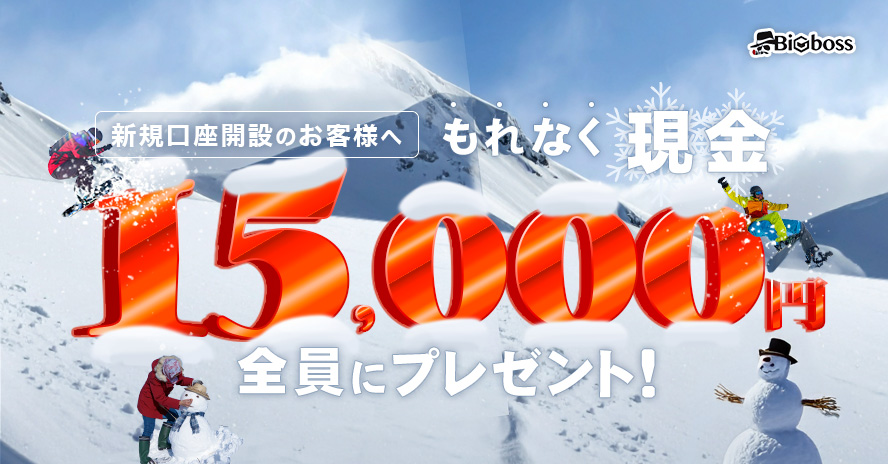 キャンペーン期間中に、当サイトを利用して海外FXブローカー【BIGBOSS】の新規口座開設をし、10万円以上のデポジットおよび合計1ロット以上のお取引をされた【お客様全員】に現金15,000円をプレゼントいたします。